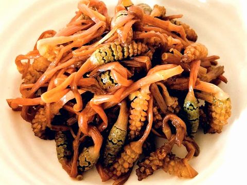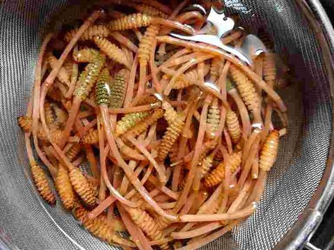 一般的に袴と呼ばれる部分(節の周りの茶色い部分)を取り除き軽く茹でて
