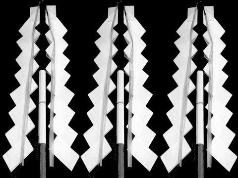 として玄関先と裏口に巨大な鈴のついた幣束がとりつけられた